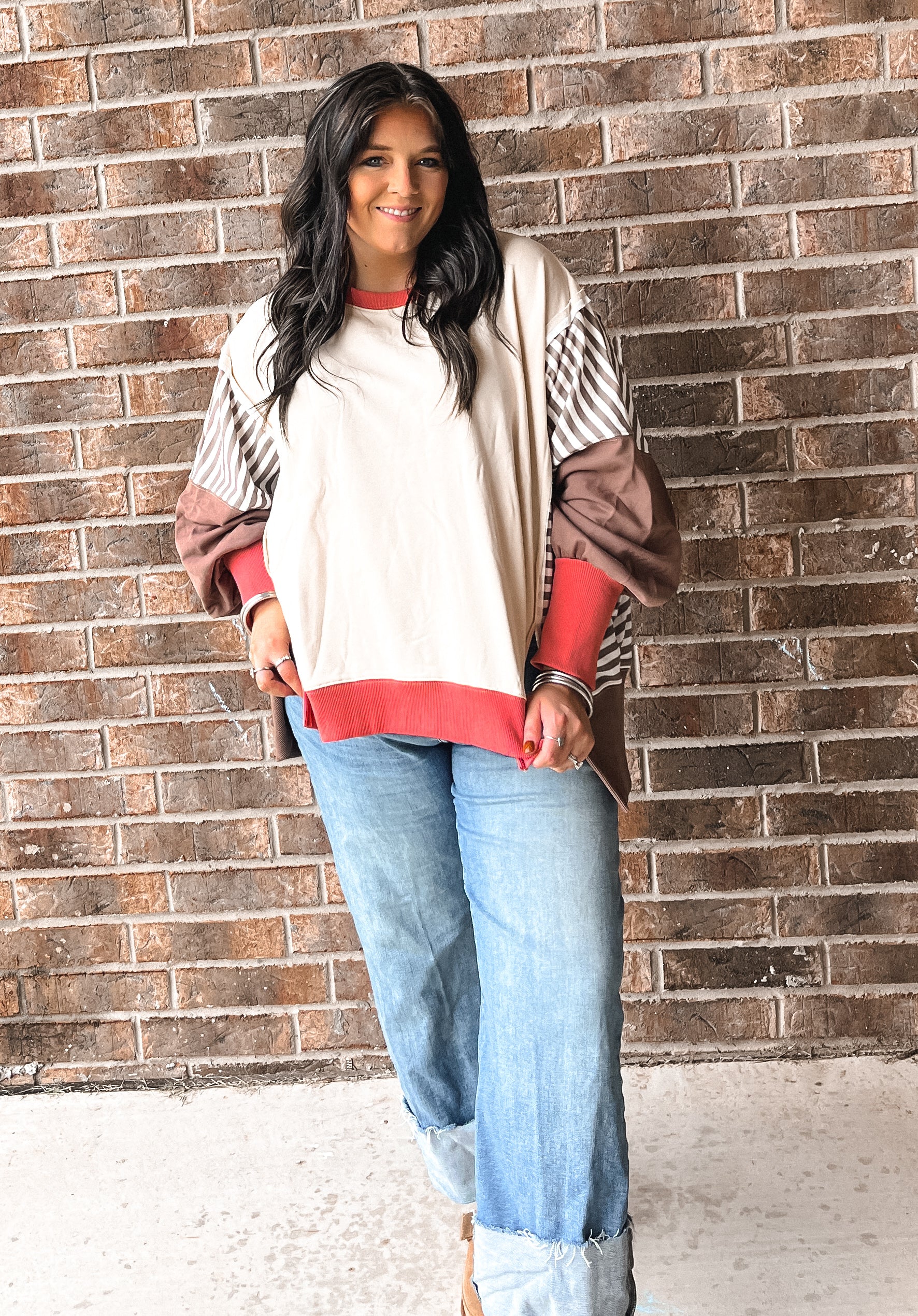 Embrace cozy vibes with the Autumn Shades Top, featuring a playful blend of mauve, cream, and mocha color blocks accented by mocha stripes. This cheerful design adds a splash of warmth and fun to your wardrobe, perfect for brightening up any day with a touch of autumn charm.