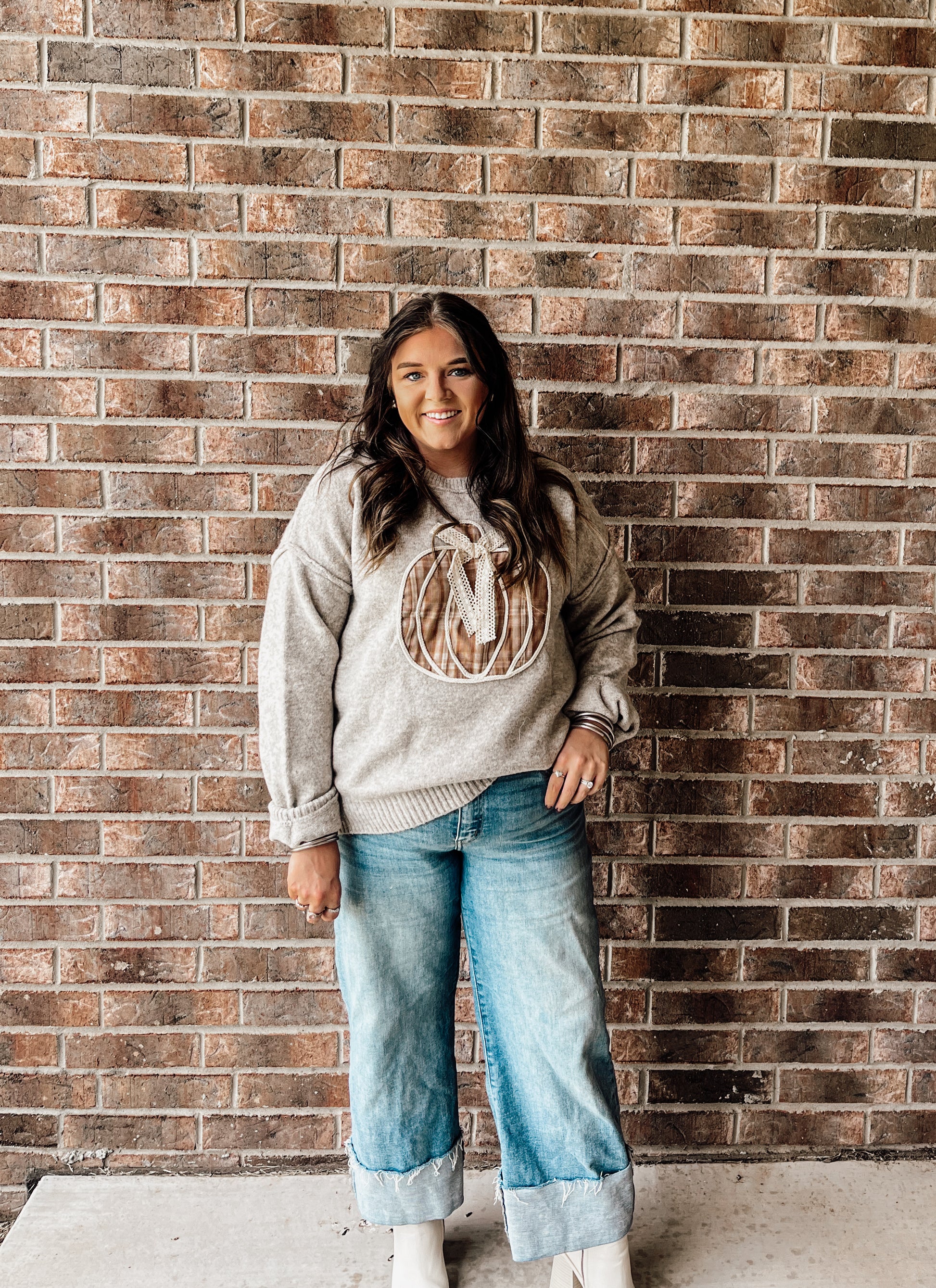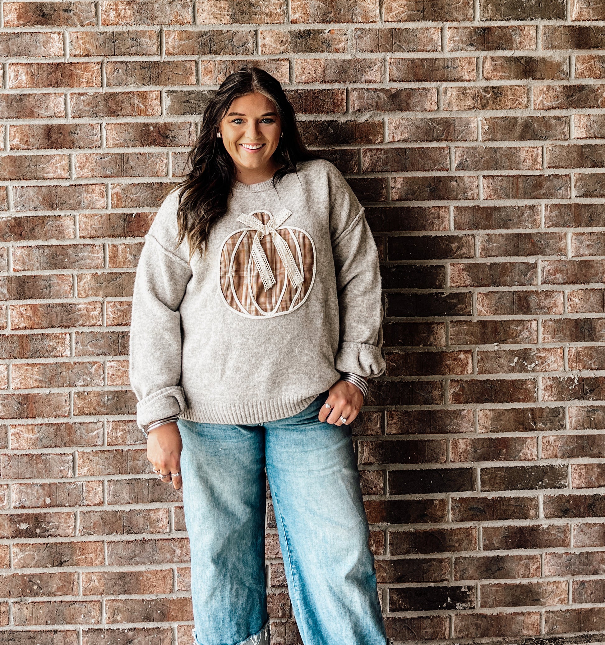 Get cozy with the Feelin' Pumpkin Spicy Sweater! This grey sweater features a charming plaid pumpkin on the front, adorned with a delicate lace bow for a sweet, playful touch. Perfect for chilly days when you want to show off your festive spirit with a bit of fun flair.