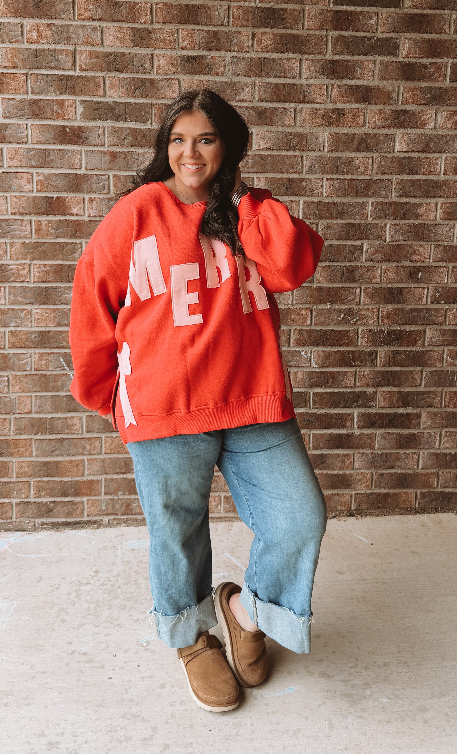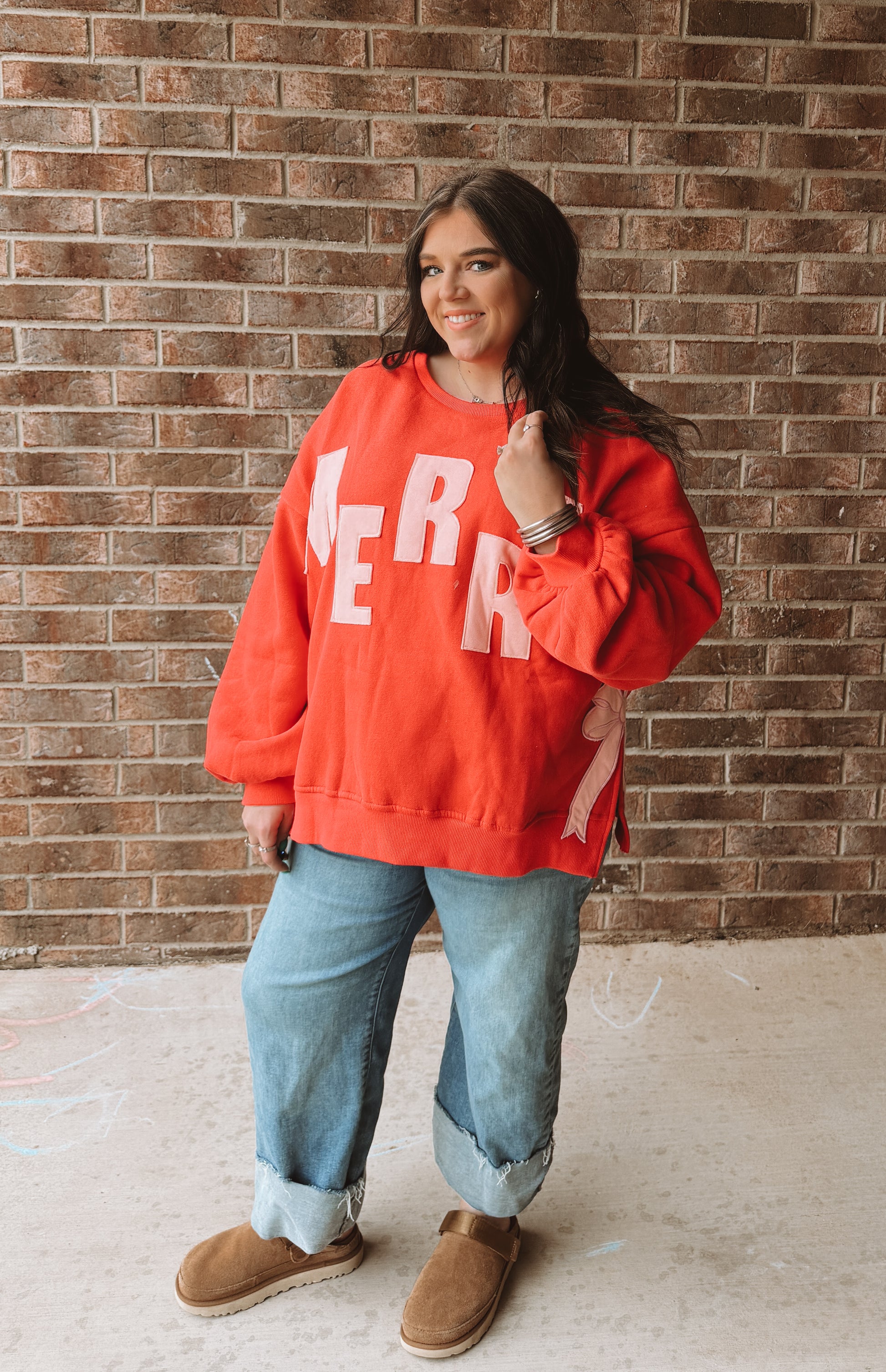 Get cozy and festive with this red sweater featuring a cheerful "Merry" in pink on the front. The playful side slit bow adds a fun twist to your holiday look, making it perfect for spreading joy in style all season long.