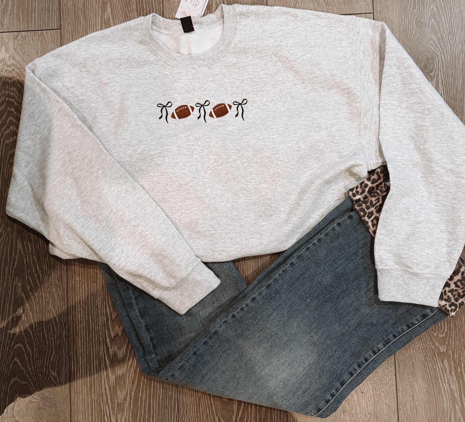 Bring some charm to game day with this Ash Sweatshirt featuring playful black bows and a cute football embroidered on the front. Soft and cozy, it’s perfect for cheering on your team in style while staying comfy. Add a touch of fun to your casual wardrobe with this sweet, spirited sweatshirt!