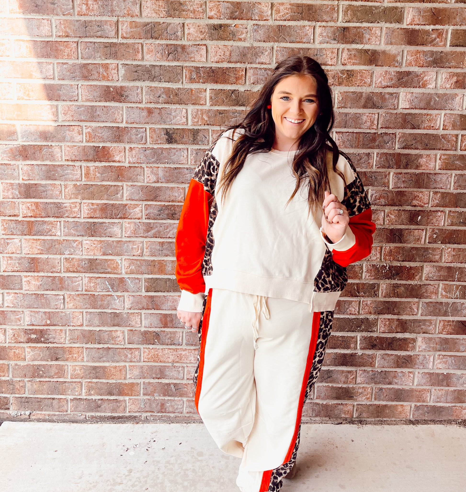 Get ready to turn heads in the Wildly Cozy Lounge Set! This cream sweatshirt features bold leopard and red accents racing down the sides, adding a fun, fierce touch to your comfy vibes. Perfect for lounging or casual outings, it mixes playful style with all-day coziness.